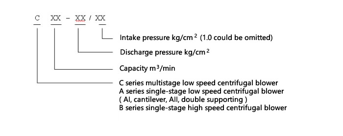 It means a multistage centrifugal blower, when temperature is 20℃, intake pressure is 1.0kgf/cm2(98kPa), relative humidity is 50%, the capacity is 300 m3/min, and discharge pressure is 1.7kgf/cm2(pressure rise 68.6kPa).