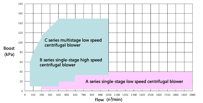 On the basis of absorbing new technology inside and outside China, Changsha Blower Co.,Ltd. and Xian Jiaotong University teamed up to develop the centrifugal blowers, that include multistage low speed centrifugal blowers, single-stage low speed centrifugal blowers and single-stage high speed centrifugal blowers, three series, more than 100 models, with the capacity 50~2000m3/min and pressure rise 10~150kPa.